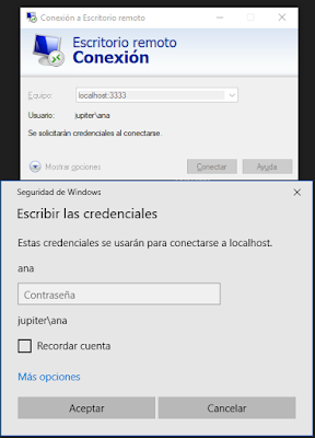 mstsc) y nos conectamos como localhost:3333. Ese puerto reenviará