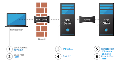 | Figura 1: Esquema de conexión tunneling SSH para conectarse por Escritorio remoto (RDP). |